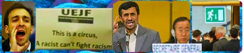 THROWING OBJECTS AT AHMADINEJAD and shouting “You are a “racist!” when he stated that “Zionists used the Holocaust as a pretext to harm the Palestinians,” the French Union of Jewish Students were ousted from the meeting while Iranian spectators cheered Ahmadinejad on. The Iranians especially cheered when Ahmadinejad said, “The Western world helped to bring to power the most cruel and repressive racist regime in Palestine.”