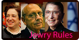 Three Jews sit on the Supreme Court Bench: Elena Kagan, Stephen Breyer, and Ruth Bader Ginsburg. While Jewry makes up less than 2% of the US population it maintains 33% representation on Amerika’s highest bench.